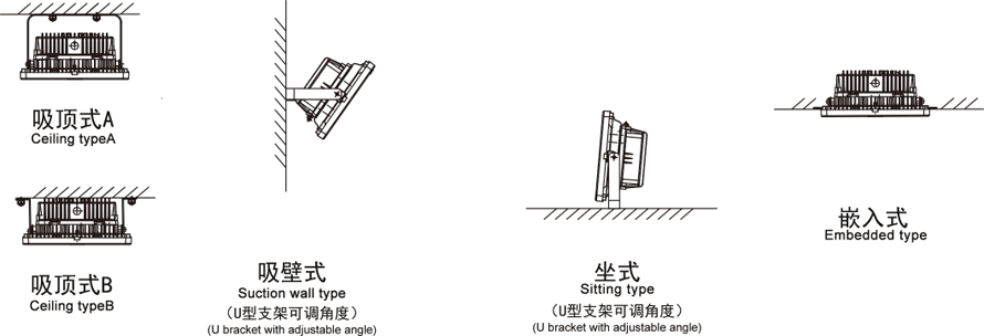 安裝方式:A:吸頂式 b:管吊式 c:吸壁式 d:法欄立桿式 e:護欄立桿式