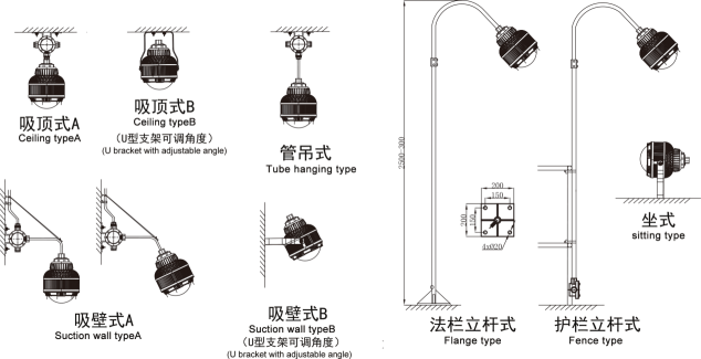安裝方式:A:吸頂式 b:管吊式 c:吸壁式 d:法欄立桿式 e:護(hù)欄立桿式